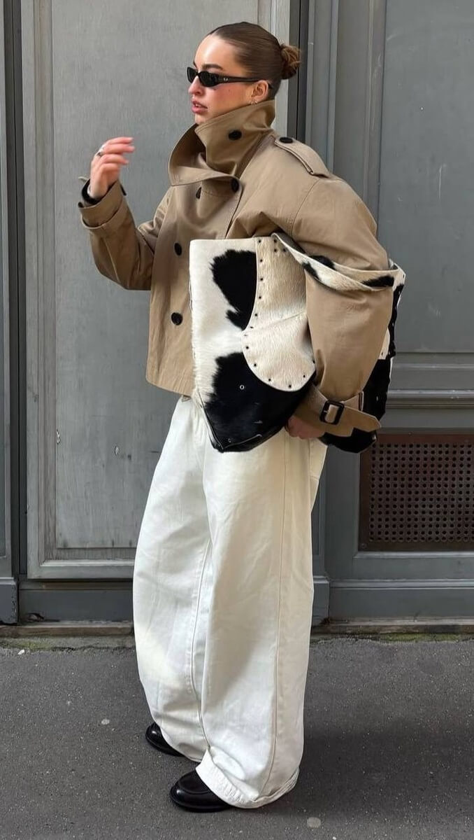 Верхняя одежда — укороченные тренчи и куртки с высоким воротником.